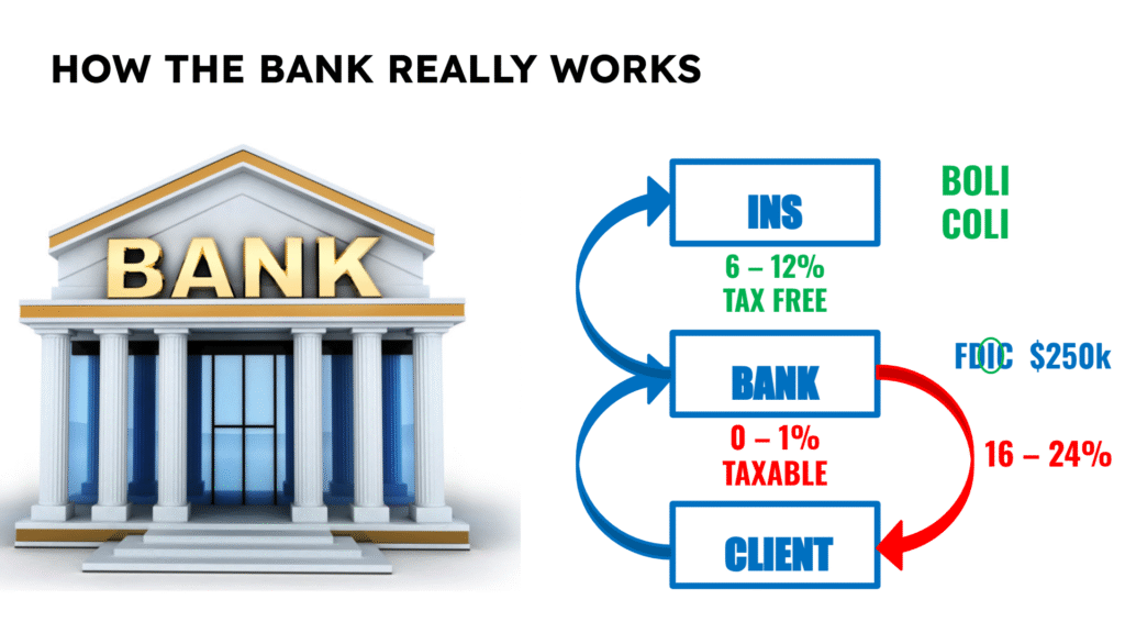 They turn around and invest your money into life insurance companies, specifically into Bank-Owned Life Insurance (BOLI). They’re earning way more than they’re giving you, growing their money tax-free, and using that cash to lend you money again—this time at 24% interest via credit cards, student loans, car loans, business loans, you name it.